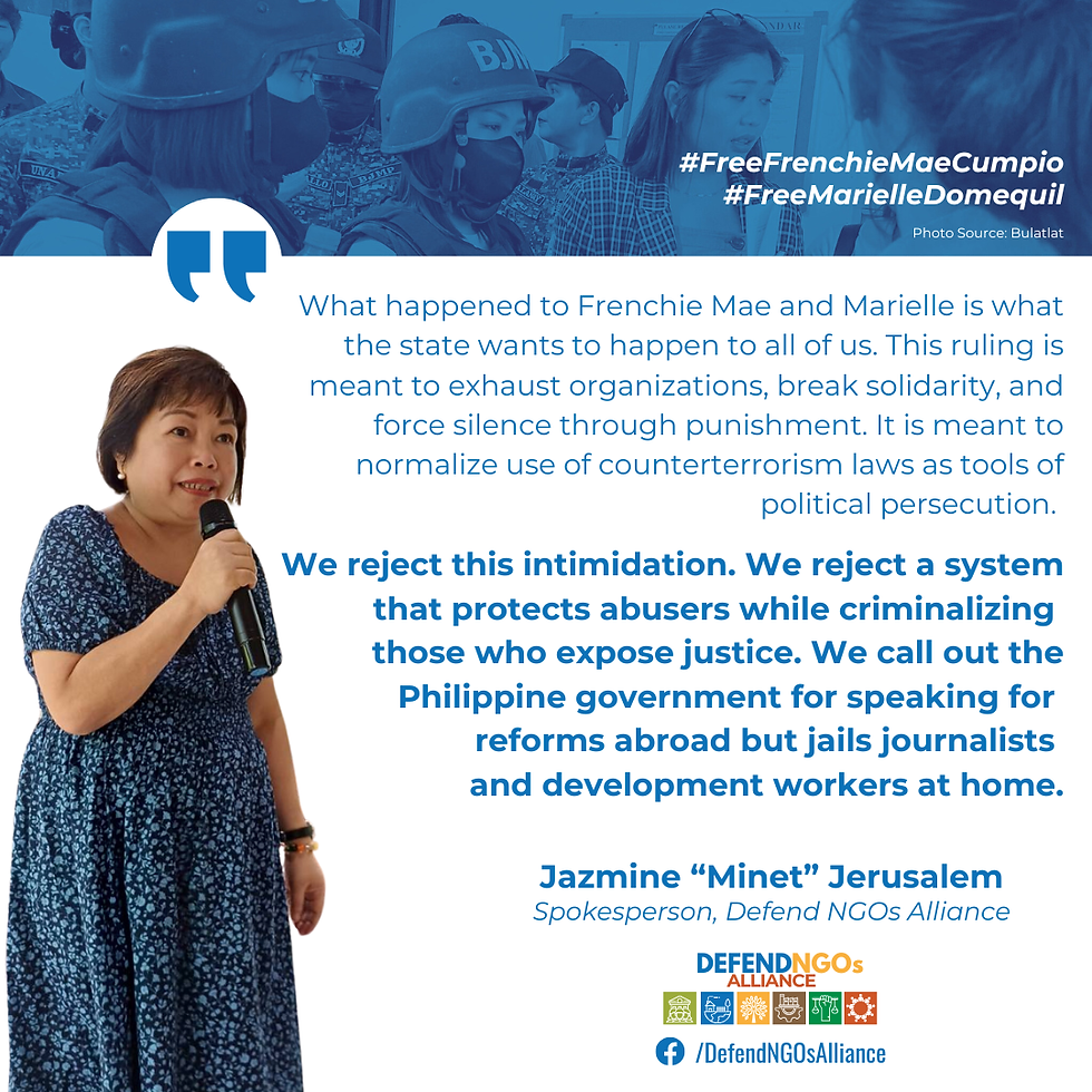 “What happened to Frenchie Mae and Marielle is what the state wants to happen to all of us. This ruling is meant to exhaust organizations, break solidarity, and force silence through punishment. It is meant to tell NGOs that documenting abuses, serving marginalized communities, and speaking truth to power will cost them their freedom. It is meant to normalize use of counterterrorism laws as tools of political persecution”, says Defend NGOs Spokesperson Jazmin “Minet” Jerusalem.